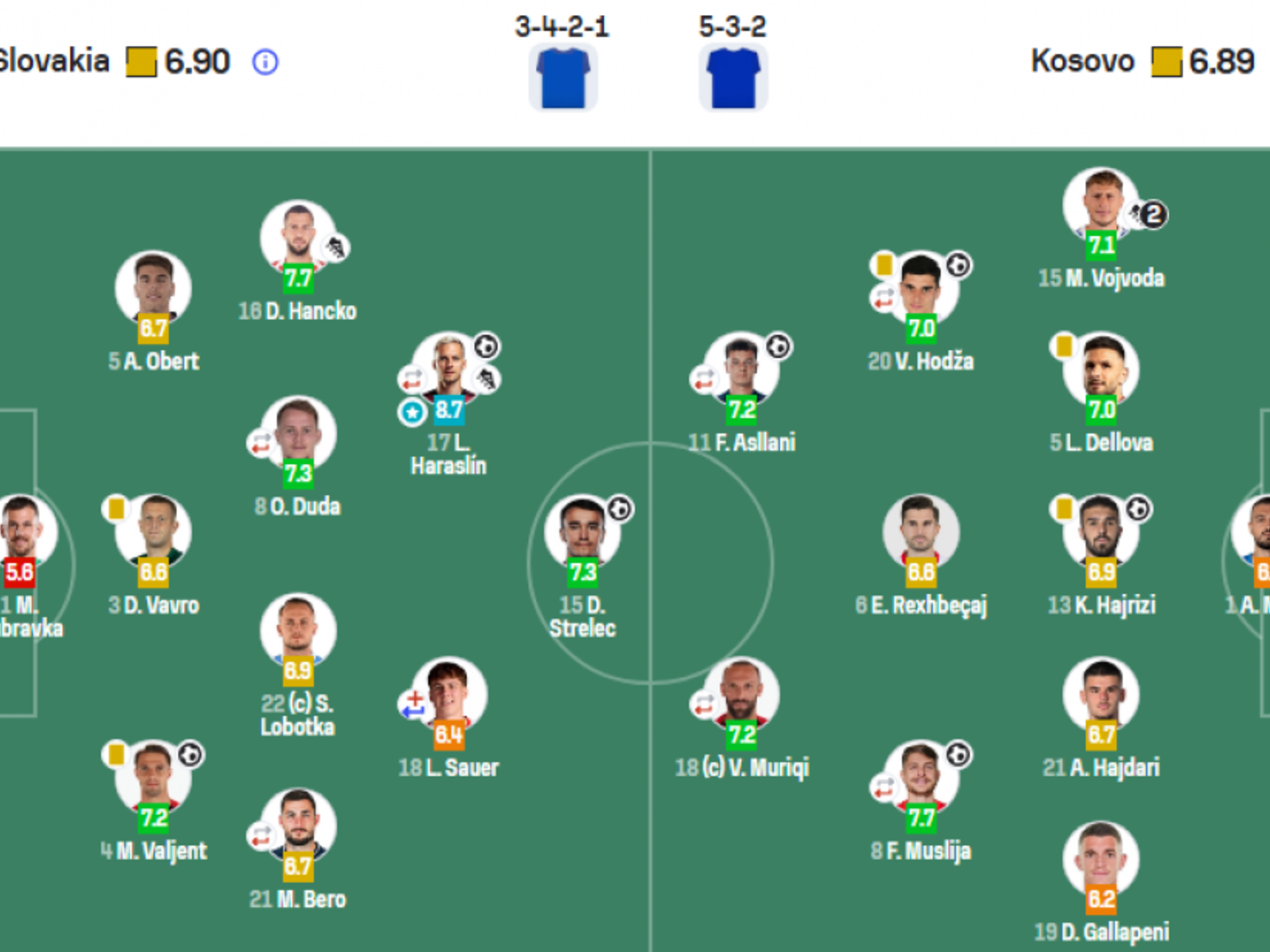 Paraqitje pozitive zhvilluan edhe Lumbardh Dellova, Hoxha (7.0) dhe Mërgim Vojvoda (7.1). Nga ana tjetër, lojtari më i mirë i ndeshjes u shpall Lukáš Haraslín, i cili realizoi gol dhe asist, duke marrë notën 8.7. Portieri Martin Dúbravka ishte zhgënjimi i sfidës, i vlerësuar me notën 5.6. Kosova tregoi karakter të jashtëzakonshëm, duke reaguar në momentet kyçe dhe duke menaxhuar presionin e ndeshjes. Skuadra e drejtuar nga Franco Foda është tani vetëm një fitore larg historisë. Finalja ndaj Turqisë pritet të jetë vendimtare për fatin e “Dardanëve”. Një triumf në këtë sfidë do ta dërgonte Kosovën për herë të parë në Botërorin 2026.